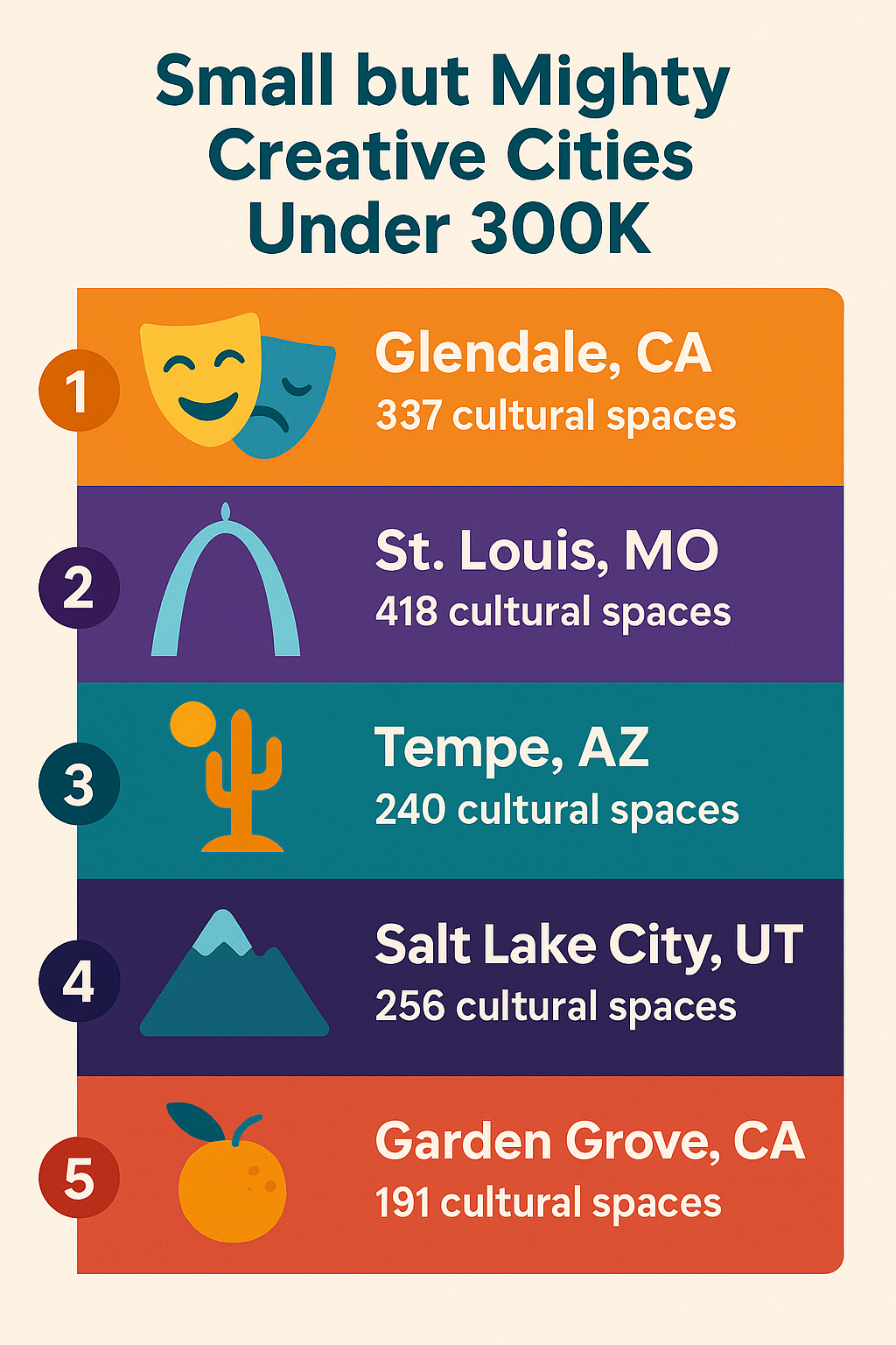 • Glendale, CA (population under 200,000) ranks in the Top 10 for museums, theaters, and overall creative density.