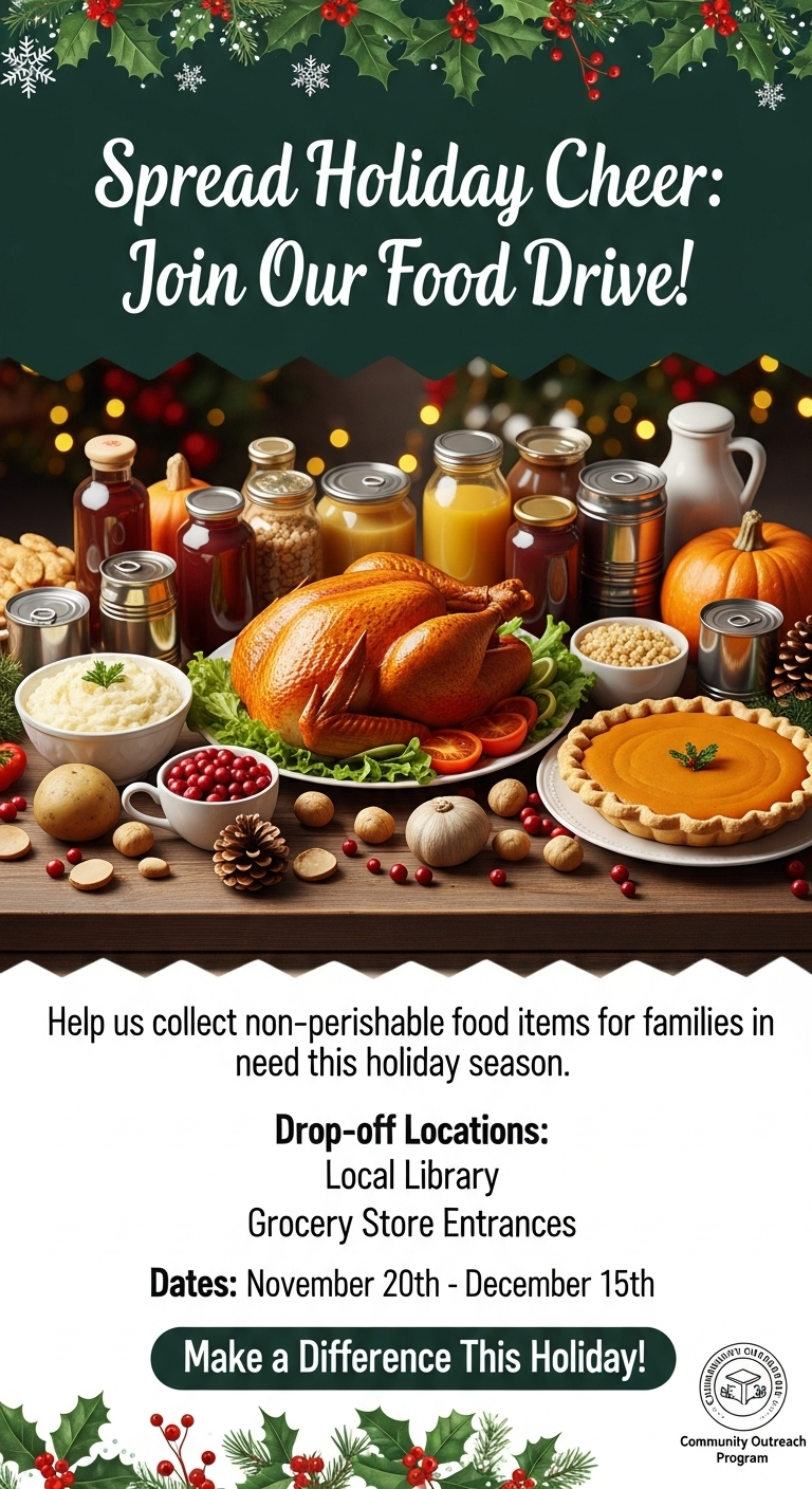 Use bold headlines, such as “Join Our Thanksgiving Food Drive,” paired with seasonal imagery like pumpkins, harvest foods, or autumn leaves.