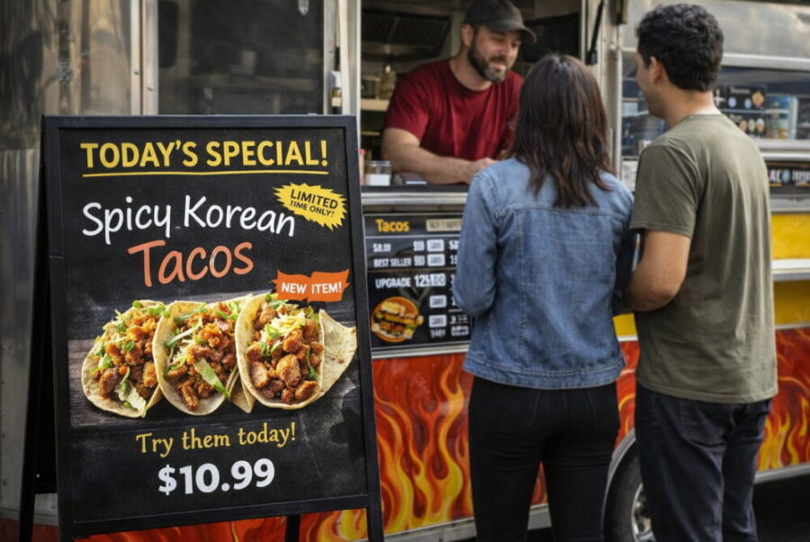 - Print small menu board inserts or use dry-erase signs on the side of your truck.