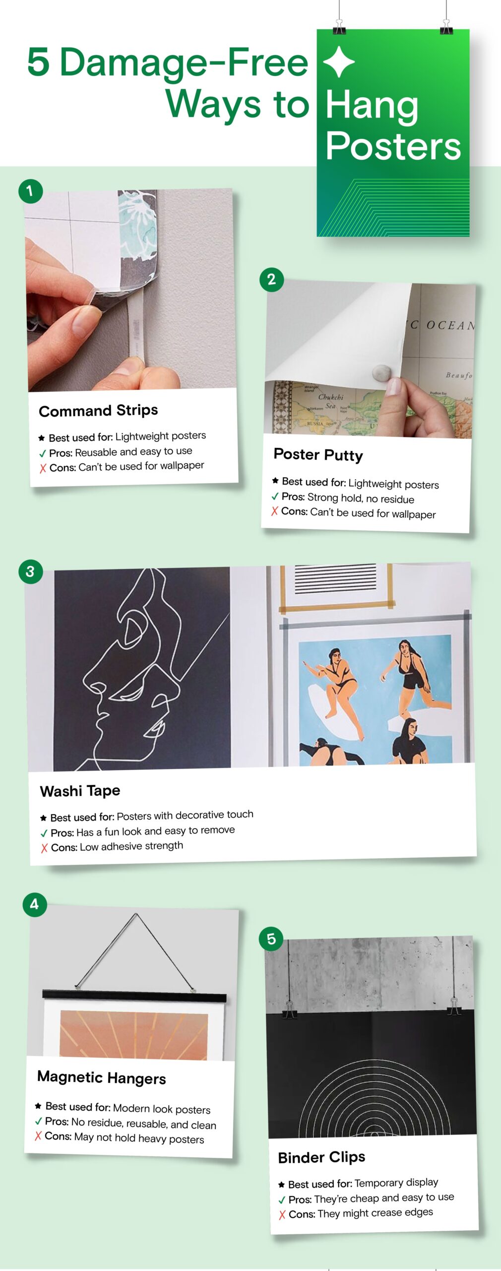 Forget about nails, staples, and thumbtacks that leave unsightly holes. Here are the best damage-free methods for hanging your posters, broken down by type.